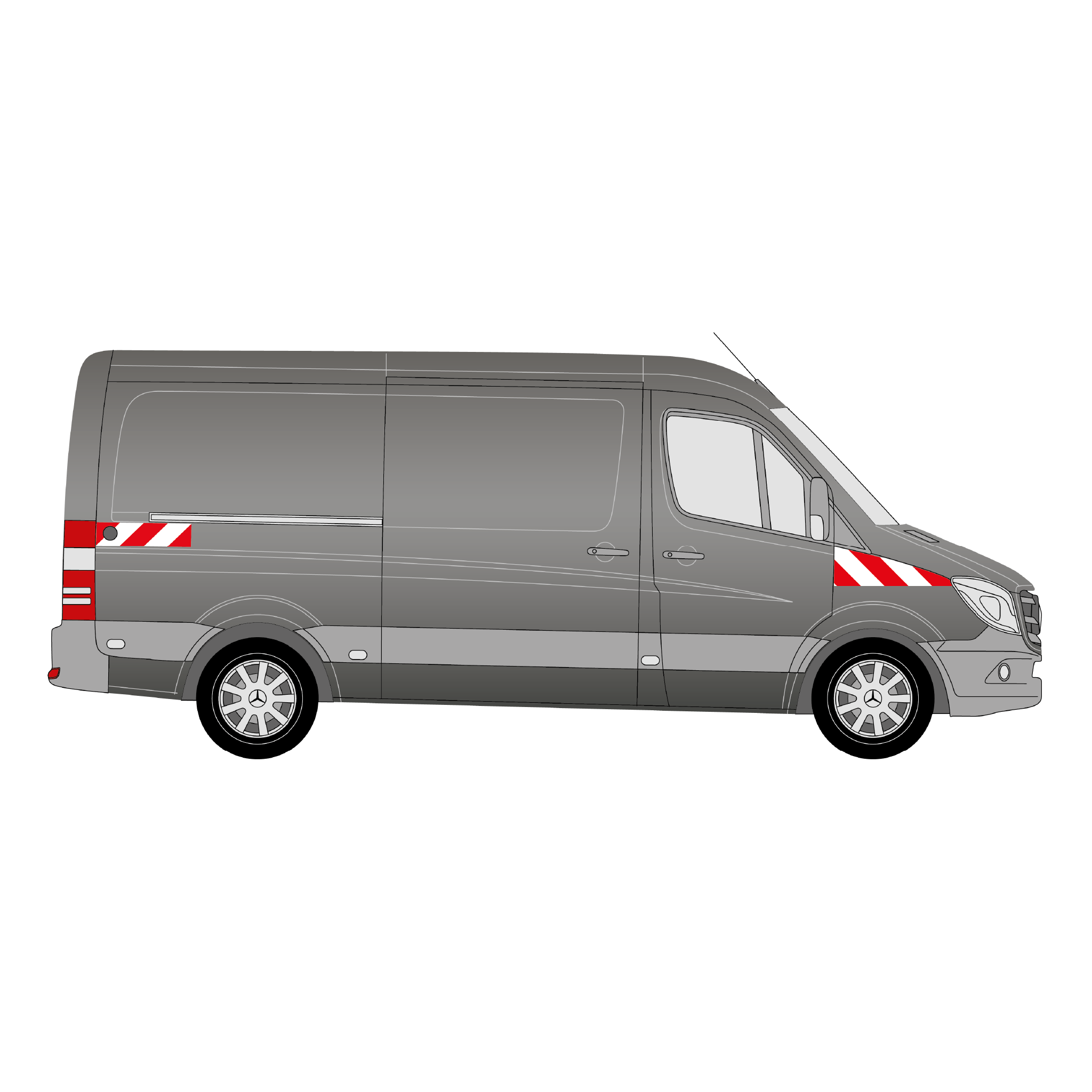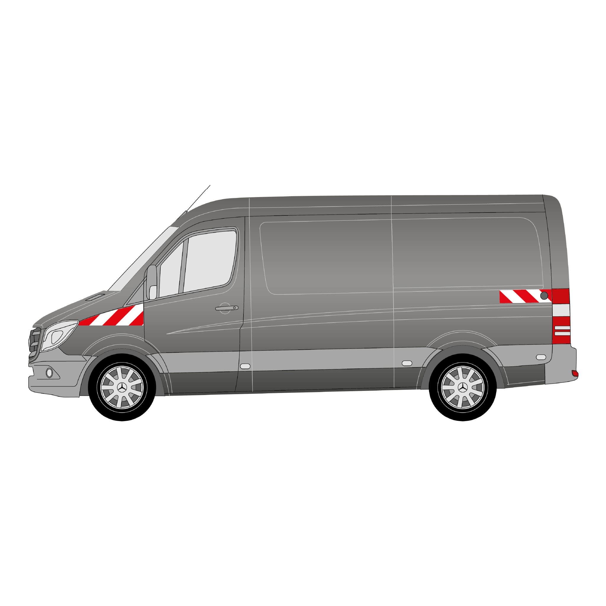 Passgenauer Warnmarkierungssatz für Front und Heck eines Transporters „Mercedes Sprinter“ (mit Kastenaufbau und Hecktüren) ab dem Baujahr 2013-2018. Der Satz umfasst mehrere zueinander passende Warnmarkierungselemente in Rot und Weiß mit rechts- und linksweisender Ausrichtung, gefertigt aus hochwertiger, stark reflektierender Folie. Das Produkt verfügt somit über die Reflexionsklasse RA2/C, was den Vorgaben der DIN 30710 und des § 35 (6) StVO entspricht.