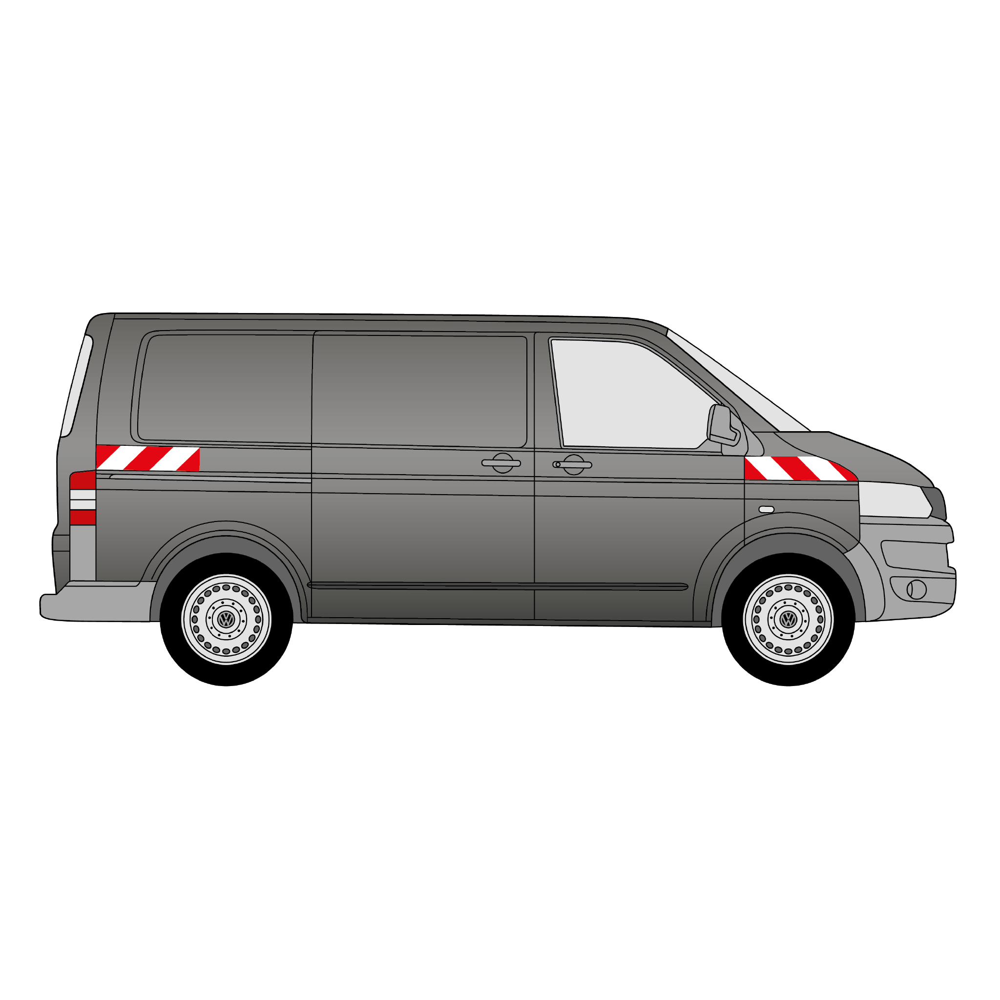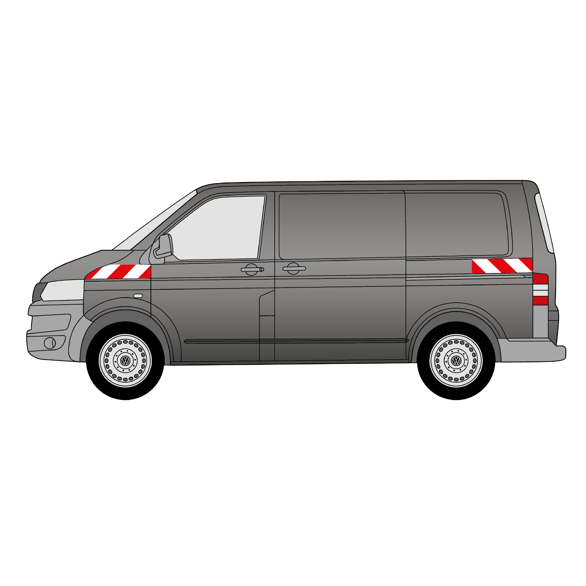 Passgenauer Warnmarkierungssatz für Front und Heck eines Transporters „Volkswagen T5“ (mit Kastenaufbau und Hecktüren) ab dem Baujahr 2003. Der Satz umfasst mehrere zueinander passende Warnmarkierungselemente in Rot und Weiß mit rechts- und linksweisender Ausrichtung, gefertigt aus hochwertiger, stark reflektierender Folie. Das Produkt verfügt somit über die Reflexionsklasse RA2/C, was den Vorgaben der DIN 30710 und des § 35 (6) StVO entspricht.